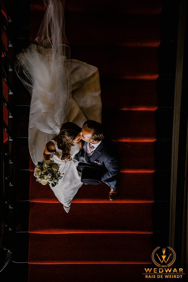 Top-down shots mean so much more than just shooting the drone.. I saw the couple walking down the stairs right after their civil wedding and saw the golden opportunity of this beautiful shot from adobe.