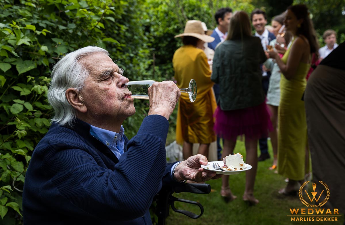Grandpa was enjoying his cake with a glas of champagne, sitting in a corner, enjoying himself on his own :)