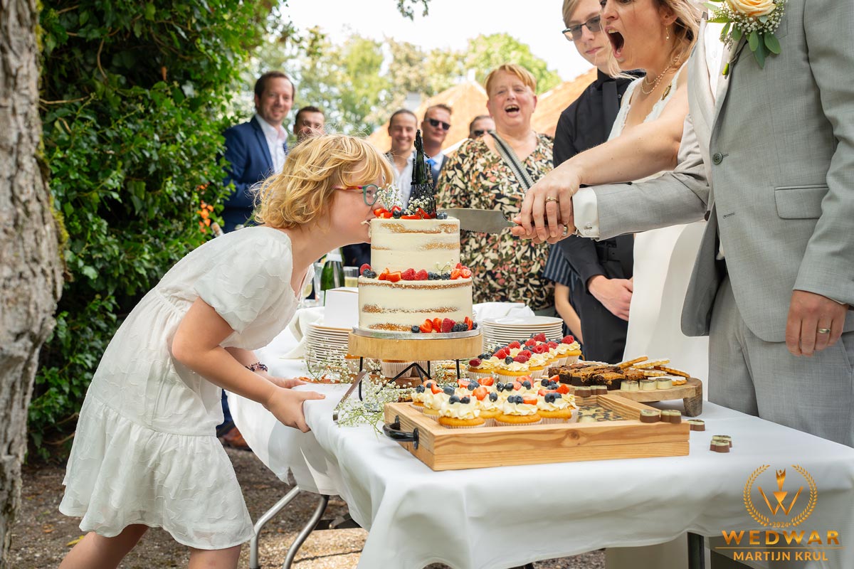 As the cake was being cut, the little girl took a big bite out of the wedding cake. Her mother's reaction turned it into a hilarious moment.