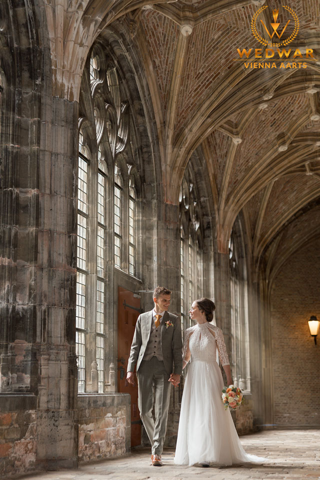 Lovely bridal couple walking in a monastery. It was a great wedding!