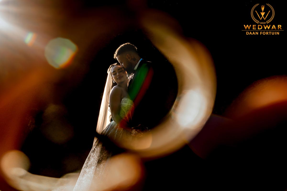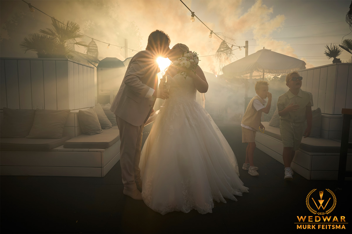 In a haze of drifting smoke, the couple leans in and seals their moment with a kiss. The sun peeks through right between them, bursting into a perfect star as if blessing the scene. And then….life happens. Two little boys stroll by, pinching their noses with dramatic gestures, turning this dreamy, romantic moment into something wonderfully real and unexpectedly funny. A perfect reminder that love is magical, but never without a touch of humor.