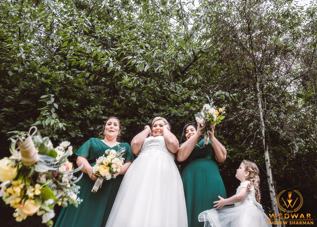 This shot is taken from the ground up as I wanted to get the bride and her bridesmaids to throw their bouquets in the air and as the bride did she threw it forward instead of up and hit my 2nd shooter with it it was an hilariously capture moment especially with little Evelyn complaining to her mom she wanted a drink aswell haha
