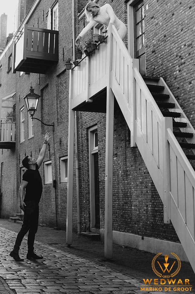 I really love the story of Romeo & Juliet. That's why I chose this composition, with a modern twist and touch of humor. See stairs on the right!